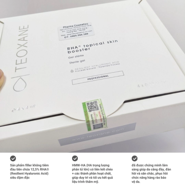 Được xem là “phiên bản không tiêm” của filler, sản phẩm chứa tới 12,5% RHA® (Resilient Hyaluronic Acid) – dạng Hyaluronic Acid liên kết chéo độc quyền từ Teoxane, kết hợp cùng phức hợp Dermo-Restructuring Complex (DRC) và các vitamin, khoáng chất tái tạo tế bào, giúp phục hồi, cấp ẩm, chống lão hóa toàn diện.
